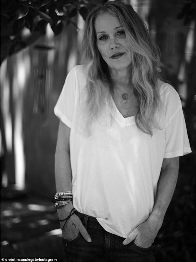 Applegate, who jokingly offered ‘Apologies for the half tuck of the shirt,’ added that it was snapped ‘in my backyard with the chimes that remind me of my mother and a moon necklace from a dear witchy friend.’
