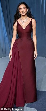 Demi Moore, 62, made her grand arrival at the event in a ravishing maroon gown with a low-cut neckline that allowed her to showcase her diamond jewels