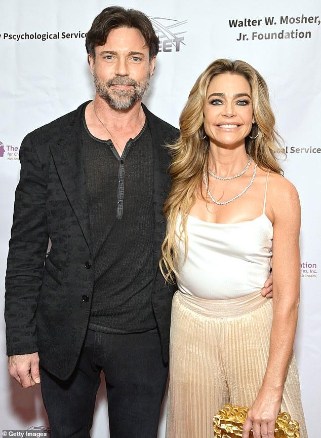 Denise Richards’ ex Aaron Phypers has been arrested outside of court over charges of ‘spousal abuse’ on Friday amid their ongoing divorce battle; seen in May in Universal City