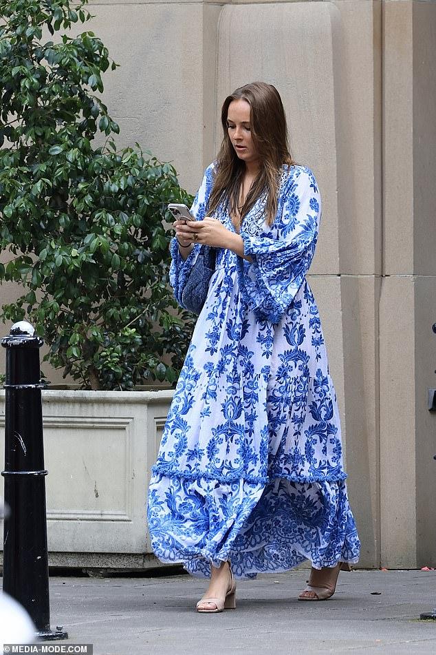 She accessorised her look with a pair of beige heels and left her brunette locks out as she enjoyed a fun day out with friends.