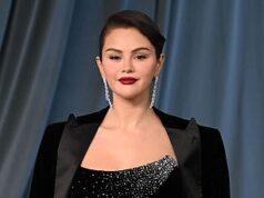 Gomez’s makeup was classically done for the evening and comprised of a layer of mascara to her lashes as well as a pink blush to her cheekbones. A dark red tint was worn on her lips for a final touch