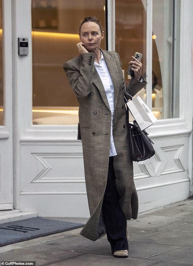Stella McCartney, 54, wearing a long double-breasted tweed coat, was seen waiting in the reception of celebrity skin care expert Keren Bartov and getting increasingly irritated