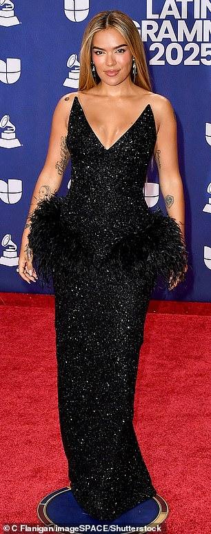 Karol G, 34, who will be performing at the ceremony, sizzled in a plunging shimmering black gown with a feather trim as she arrived at the MGM Grand Garden Arena in Las Vegas, Nevada.