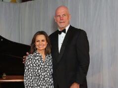 The AFL WAG was a vision of sophistication in a burgundy Eliya gown teamed with matching Lana Wilkinson heels. Pictured with husband Chris