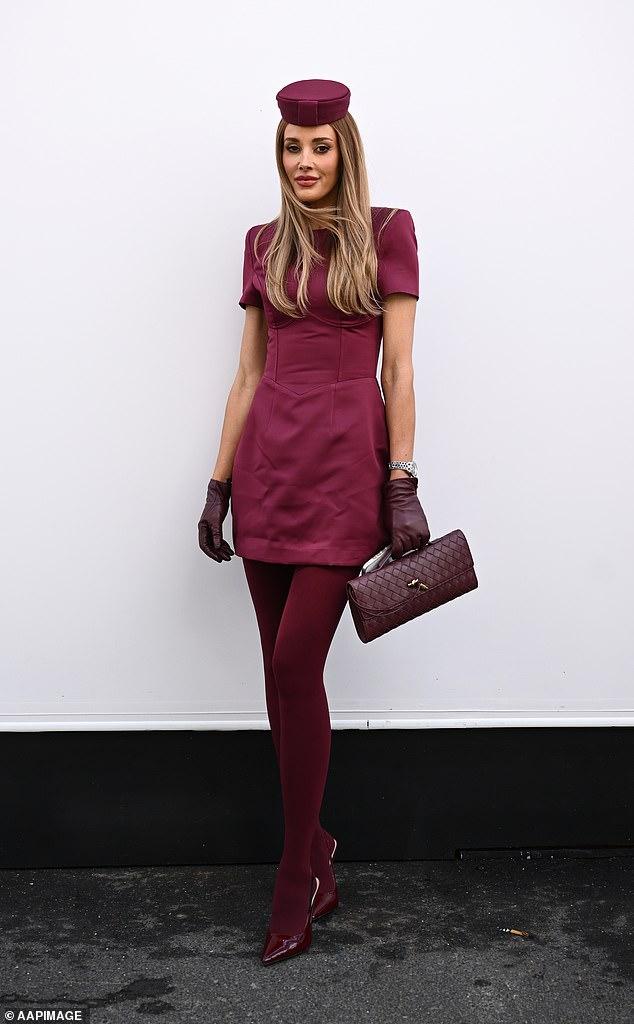 Rebecca Judd (pictured) has been brutally roasted after attending the Melbourne Cup Carnival on Tuesday in a burgundy mini dress
