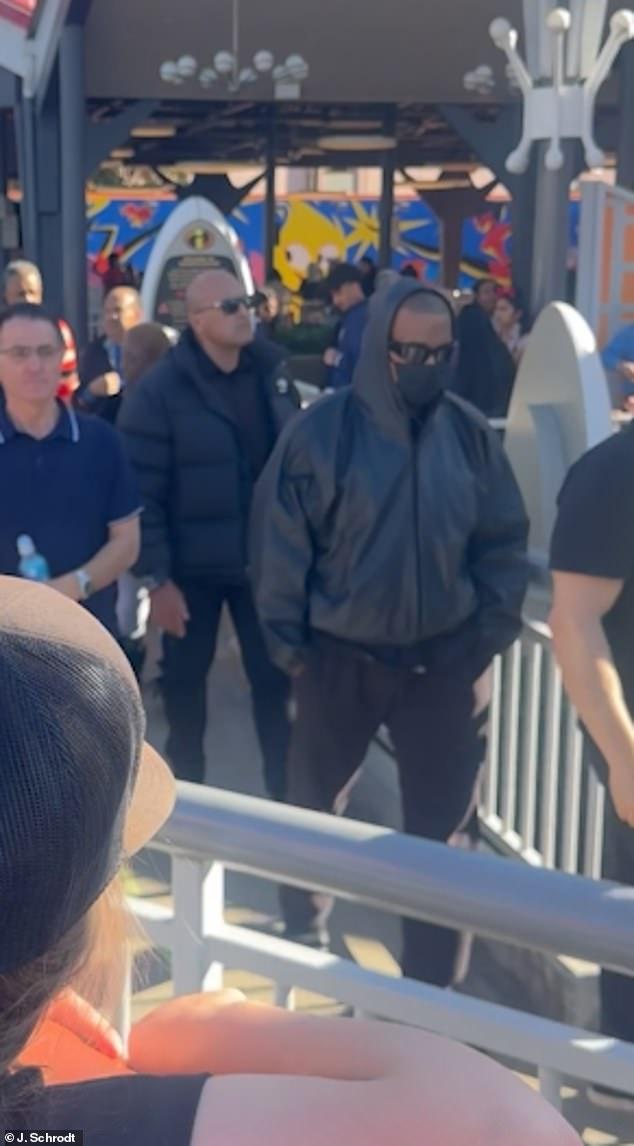 A Disneyland employee was seen guiding the massive group through the amusement park in a day that saw West hop onto the Incredicoaster.