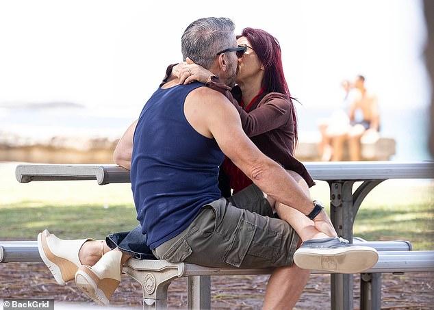 The pair shared a passionate kiss on a park bench by the beach, oblivious to onlookers