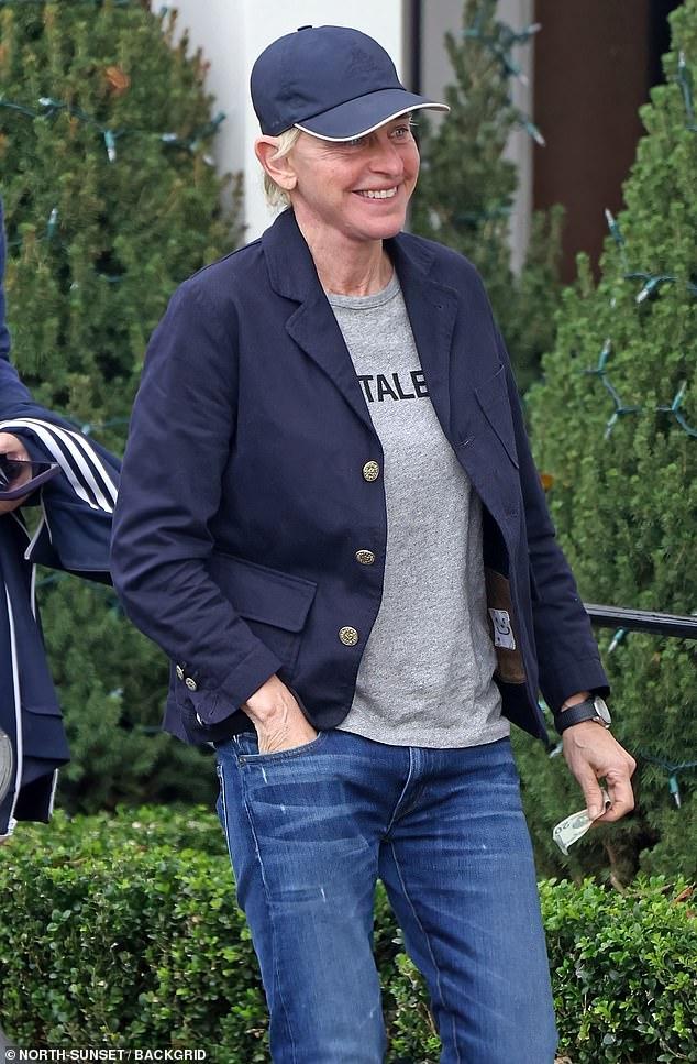 During the latest excursion on Tuesday, DeGeneres kept it casual sporting a gray-printed shirt as well as a pair of denim jeans and dark navy blazer on top.