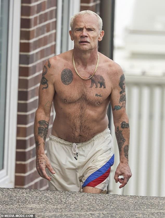 On Tuesday, the 63-year-old musician looked almost unrecognisable as he strolled shirtless through Sydney’s Bondi Beach in nothing but a pair of grey boardshorts.