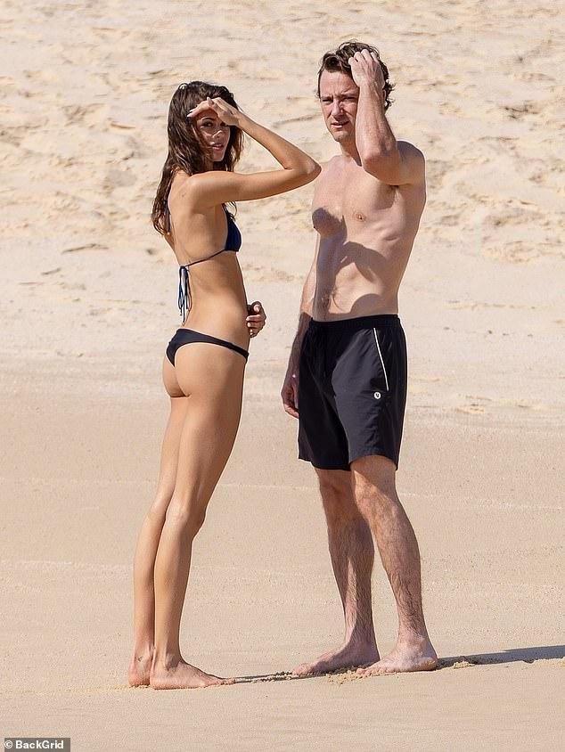 Gerber flaunted her slim figure in a triangle top paired with black Brazilian bottoms and Pullman went shirtless in black swim trunks
