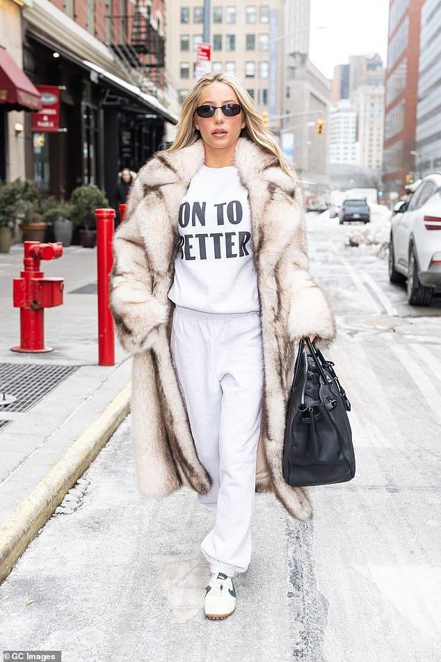 She styled her poignant sweatshirt with matching sweatpants, a glamorous fur coat and a large black Hermes bag