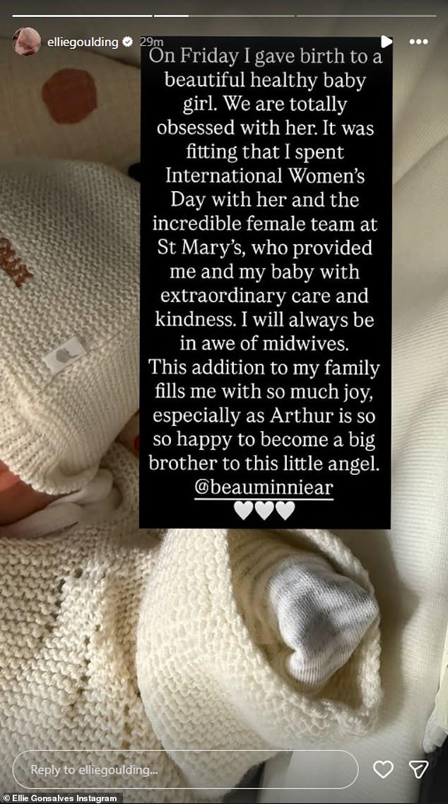 Ellie Goulding has revealed she has welcomed her second child, a baby girl and her first with boyfriend Beau Minniear.