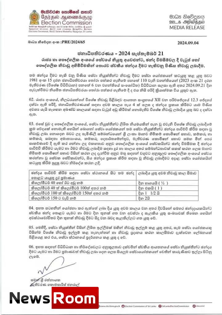 රාජ්ය හා පෞද්ගලික අංශයේ සේවයේ නියුතු අයවලුන්ට, ඡන්ද විමසීම්වල දී වැටුප් හෝ පෞද්ගලික නිවාඩු අහිමි වීමකින් තොරව ස්වකීය ඡන්දය දීමට හැකිවනු පිණිස නිවාඩු ලබා දීම සම්බන්ධව මැතිවරණ කොමිෂන් සභාව නිවේදනයක් නිකුත් කර තිබේ.