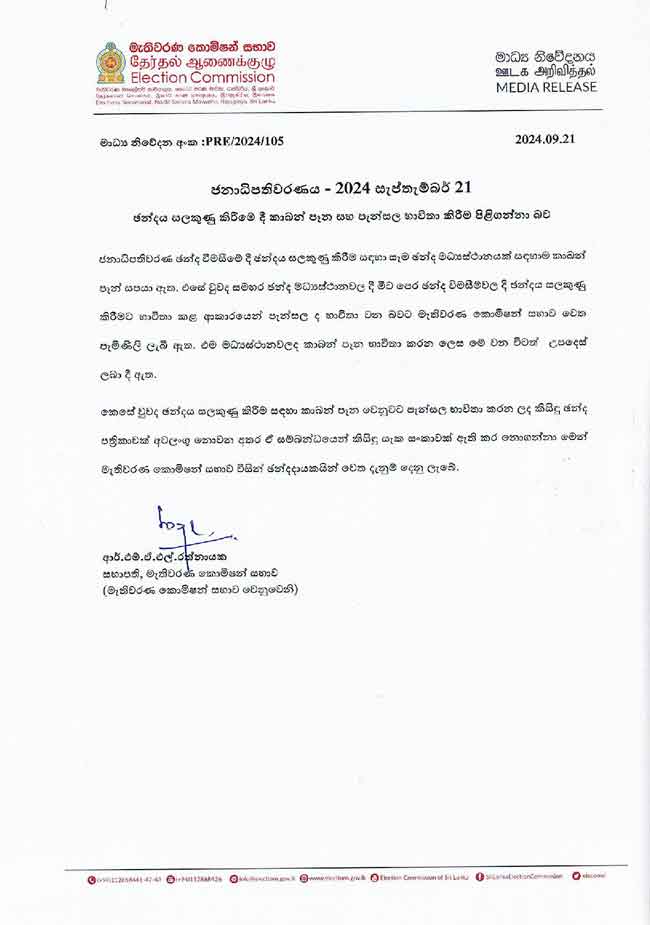 මැතිවරණ කොමිෂන් සභාව නිකුත් කළ නිවේදනය පහතින්,