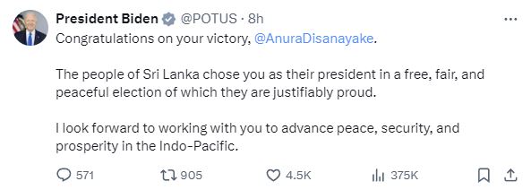 අමෙරිකානු ජනාධිපති ජෝ බයිඩන් ශ්රී ලංකාවේ නව ජනාධිපතිවරයා ලෙස තේරී පත්වූ අනුර කුමාර දිසානායක මහතා වෙත සුබ පැතුම් පණිවුඩයක් යොමු කර තිබෙයි.