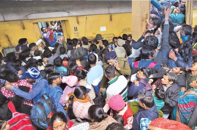 එදින දිනය පුරා පැයකට දුම්රිය ප්රවේශපත්ර 1,500 බැගින් අලෙවි වී ඇති අතර, ගමනාන්තය කරා ධාවනය වන ප්රයාග්රාජ් එක්ස්ප්රස් දුම්රිය 14 වැනි වේදිකාවට ළඟාවන විට එහි අතිවිශාල බැතිමතුන් පිරිසක් රැස්ව සිටි බව ද වාර්තා වේ. මගීන් දුම්රියට නැඟීමට උත්සාහ කරද්දී දැඩි නොසන්සුන් තත්ත්වයක් සමඟ තෙරපීම සිදුවී ඇති අතර, එම තත්ත්වය පාලනය කිරිමට ආරක්ෂක අංශය අසමත්වූ බව ද වාර්තා වේ.