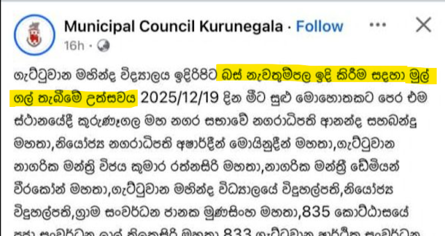 කුරුණෑගල ගැට්ටුවාන මහින්ද විද්යාලය ඉදිරිපිට බස් නැවතුම්පල ඉදි කිරීම සදහා මුල් ගල් තැබීමේ උත්සවය එම ස්ථානයේදී පැවැත්වී ඇත.