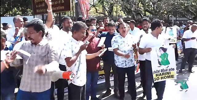 ඉසුරුපාය අධ්යාපන අමාත්යාංශය ඉදිරිපිට විරෝධතාවයක නිරත පිරිසක් විසින් අග්රාමාත්ය හරිනි අමරසූරිය මෙනෙවියට හූ තබා සිය විරෝධය පළ කර තිබේ.